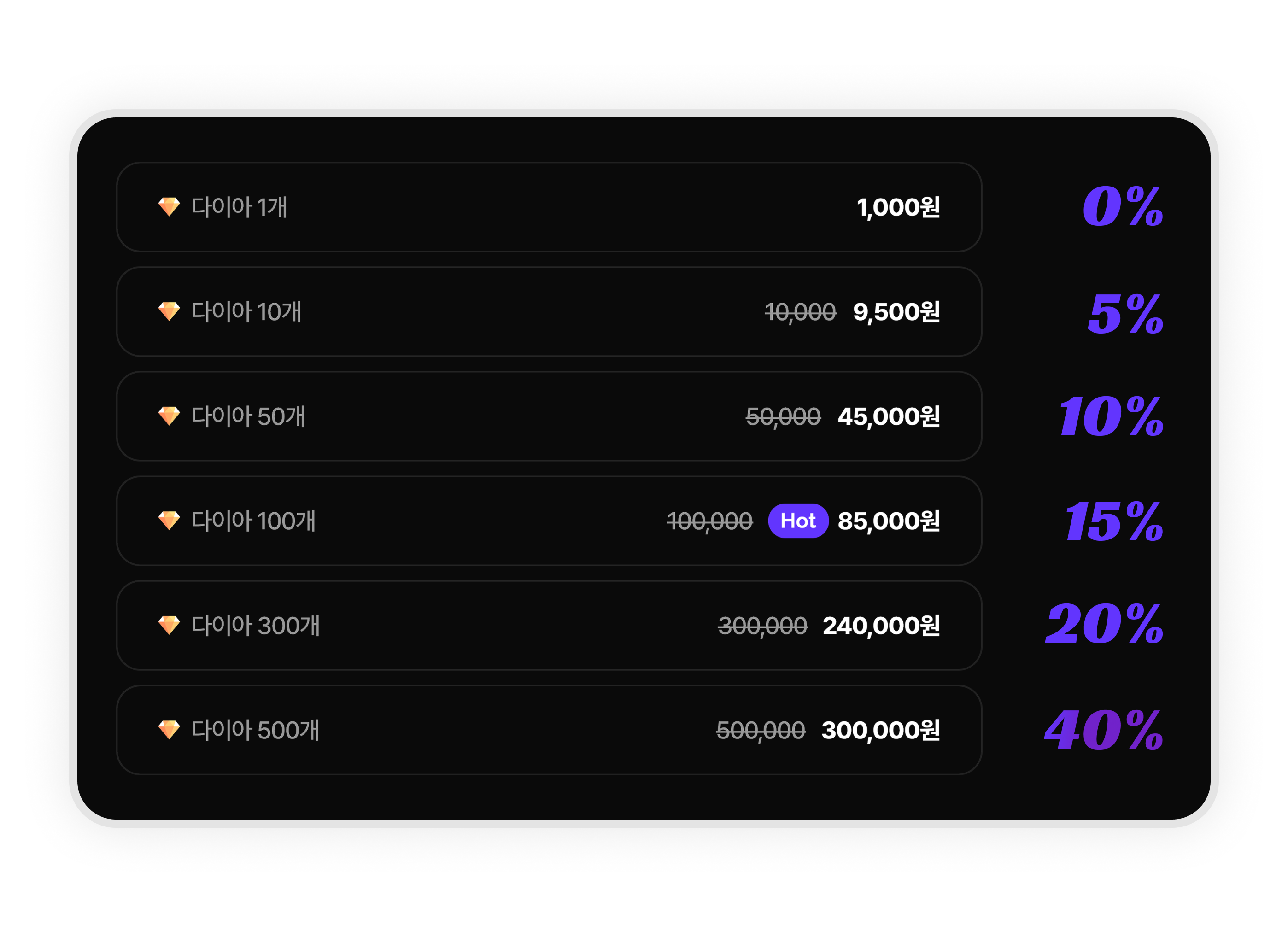 설명다이아는 아래와 같은 가격으로 판매되고 있어요. 한번에 많은 수량을 구매할 수록 할인율이 커져요.자세한 상품 구성은 아래를 참고해 주세요.수량에 따라 할인된 금액으로 바로 구매하실 수 있어요