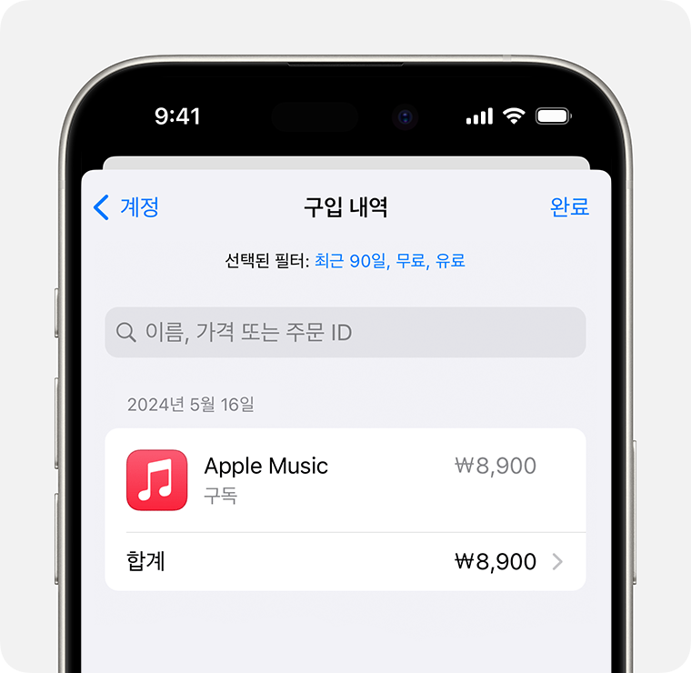 구매 내역 확인 방법 1: 설정 → 상단의 사람 얼굴 → 미디어 및 구입 항목 → 계정 보기 → 구입 내역 → 해당하는 결제 건 선택