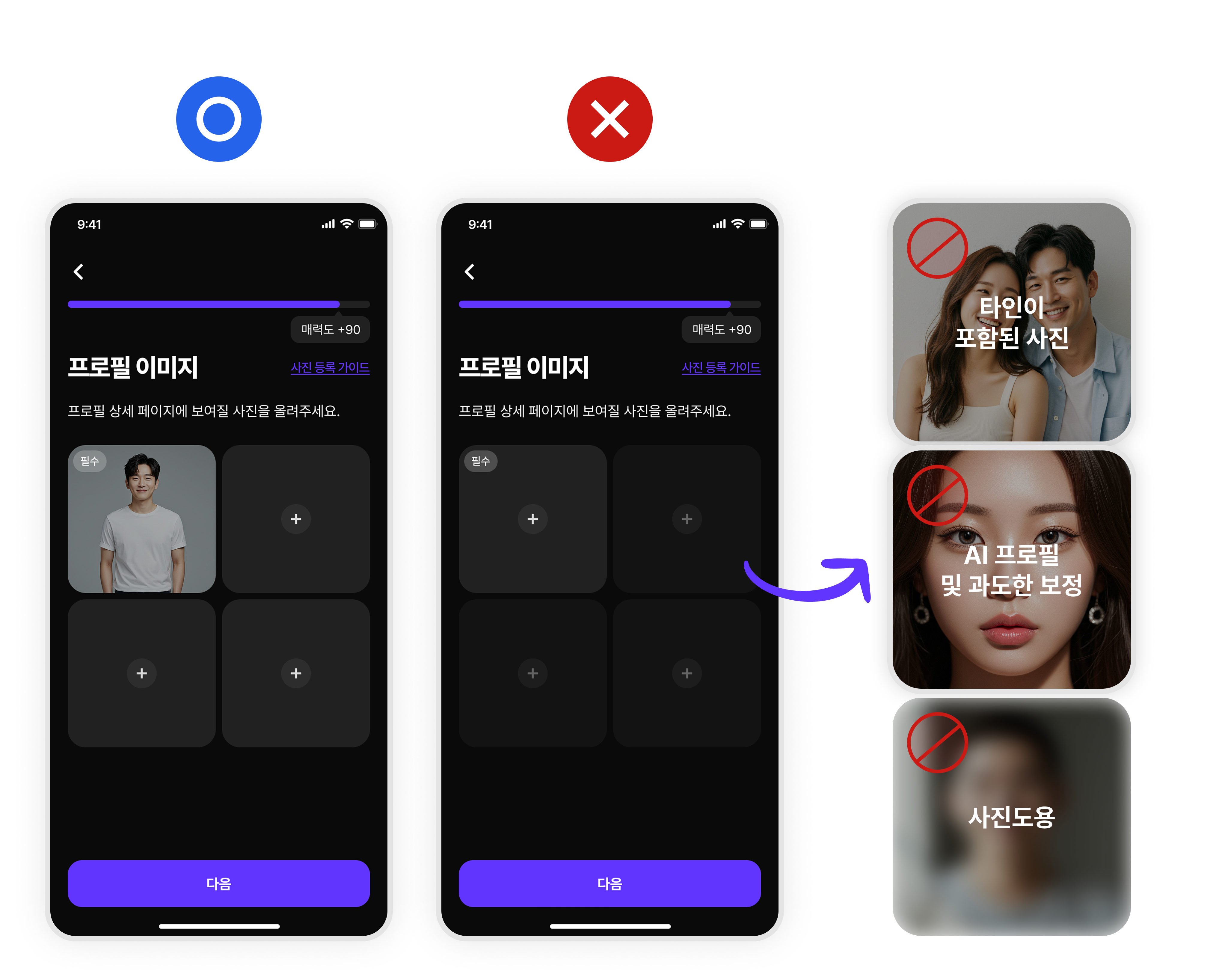 AI 등으로 생성된 실제 존재하지 않는 사진 또는 타인의 사진을 도용할 경우 민·형사상의 책임을 질 수 있습니다. 반드시 본인의 사진만 등록해 주세요.